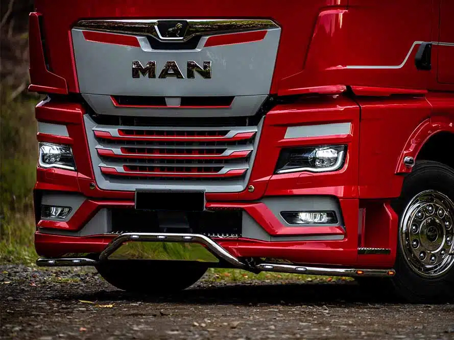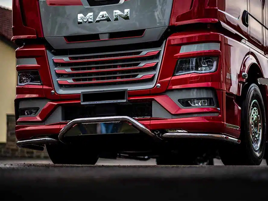 Die 3-teilige Lowbar für MAN TGX ab Baujahr 2021 setzt ein klares Statement auf der Straße. Markantes Design trifft auf massive Edelstahl-Qualität – für einen Auftritt, der sofort auffällt.